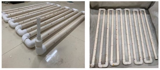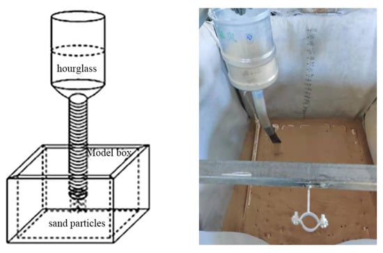 In order to determine the saturation level Sr of the sand foundation, a saturation test was carried out before each experiment and accordingly, it was found that the Sr was 0.9. A pluviation method was used to construct the foundation. The falling distance was 40 cm. Based on the anti-seepage design of the model shear box, the saturation device was designed at the bottom of the model box. Due to the capillary action, deaired water entered the sand foundation evenly and quickly. The standard saturation level of the undisturbed sand foundation was prepared by undrained saturation [35,36,37]. Figure 2 and Figure 3 show the preparation process and the saturation device, respectively [38,39,40].