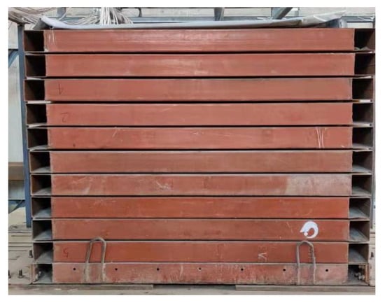The test device mainly consists of a shaking table, a model box, and a loading device. The shaking table is a one-way hydraulic shaking table. The input acceleration was set to 0.2 g. A rigid laminated shear box was adopted to eliminate the boundary effects in the model. The box has a square frame with 11 layers, an inner side length of 1.2 m, and an outer length of 1.4 m. Six 12 mm diameter hard rubber rods with the same width as the frame were used as flexible bearings between each layer of the frame to reduce the friction between the frames. The model box in Figure 4 shows that the bottom was sealed with plain concrete.