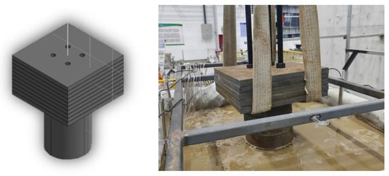 The test scale is 1:100. A scaled composite loading device was constructed to simulate the foundation of the cap-pile structure. The composite device consisted of 1 barrel load, 2 round cap plates, 10 square cap plates, and 4 bolts (piles). Figure 5 shows the isometric model and configuration of the composite loading device.