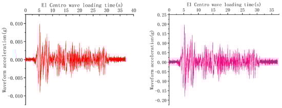 - Designing the loading wave: In the present study, an El Centro wave and small-amplitude white noise were used to reduce the influence of noise of the shaking table on the results. The damping ratio and natural vibration frequency of the model box and sand foundation were determined via a small-amplitude white noise loading test, and the resonance between the box and foundation was eliminated. After the dissipation of excess pore pressure, the El Centro wave test was carried out. In order to ensure the test accuracy, the sand was unloaded and replaced after each load test. Figure 6 illustrates the input wave of the shaking table.