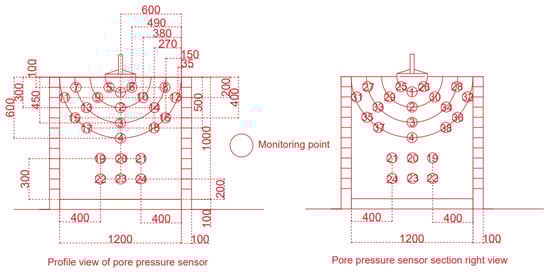The lower load diameter was defined as R0, and the approximate influence range had a diameter of 2R0 [18]. Accordingly, sensors were installed inside a circle with a diameter of 2R0 with the load center as the origin. To analyze the influence of load on the liquefaction resistance of sand, the spacing between sensors was set beyond this range. Figure 7 shows the layout of pore pressure sensors.