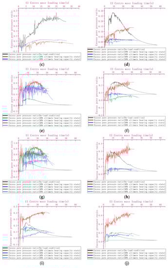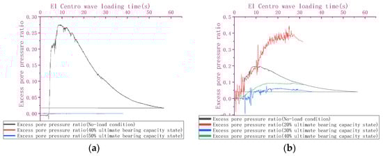 Based on the measured excess pore pressures of the foundation soil at different buried depths and the calculated excess pore pressure ratio using Equation (2), foundation liquefaction was analyzed under different loads. The excess pore pressure ratio is defined in the form below: