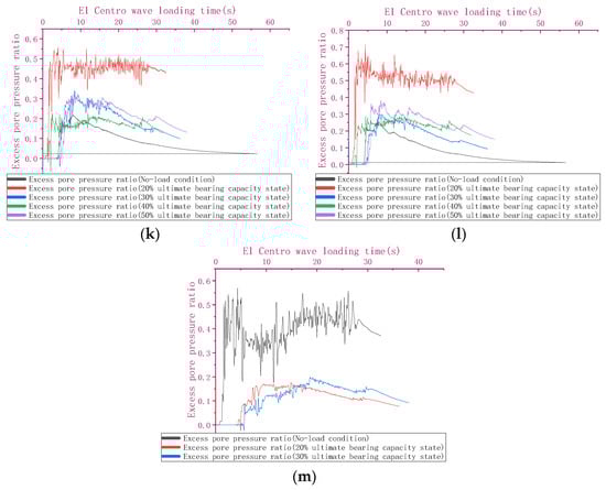 Excess pore pressure ratio of soil at different buried depths. (a) Monitoring point 1, (b) monitoring point 2, (c) monitoring point 3, (d) monitoring point 5, (e) monitoring point 7, (f) monitoring point 9, (g) monitoring point 11, (h) monitoring point 13, (i) monitoring point 17, (j) monitoring point 15, (k) monitoring point 19, (l) monitoring point 22, (m) monitoring point 23.