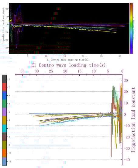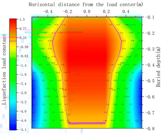 where denotes the excess pore pressure ratio of soil at a specific buried depth exposed to seismic wave under load and denotes the excess pore pressure ratio of soil mass at the buried depth exposed to seismic waves with no load condition (natural state). The liquefaction load constant is a parameter that describes the excess pore pressure ratio of soil mass at a specific buried depth under load. A positive indicates that the liquefaction resistance of soil mass is enhanced, while a negative indicates that the liquefaction resistance is degraded.