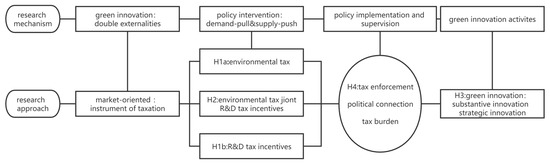 China’s environmental tax is a tax law formulated at the national level. Within the scope of the law, each province sets specific tax standards according to regional conditions, and the collection of environmental taxes varies from place to place. R&D tax incentives are formulated by the state and implemented according to unified implementation standards nationwide. The inadequate monitoring and enforcement of environmental regulatory policies will also affect the effectiveness of those policies. Strong tax enforcement will regulate the tax payment behavior of enterprises and curb their tax avoidance activities. The level of tax enforcement will affect the implementation effects of environmental taxes and R&D tax incentives. When the tax enforcement environment is weak, the collection and inspection of environmental taxes and the communication of information with the environmental protection department are prone to being exploited by loopholes. A lower cost of tax avoidance for companies weakens the pressure put on them by the cost of pollution imposed by the environmental tax and diminishes their incentive to innovate. At the same time, it is also easier for businesses to carry out lower-quality innovation to obtain more tax incentives, weakening the promotion of green innovation by these two tax policies. When tax enforcement is strong, however, the opportunities for tax avoidance and rent-seeking in the tax policy are relatively small. Thus, demand for green innovation can be better stimulated by environmental taxes and innovation can be better promoted by R&D tax incentives according to policy expectations, thus improving the policy’s implementation effect. For a clearer understanding of the content of this article, Figure 1 shows the empirical research framework.