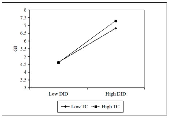 In Table 2, Column (1) represents the baseline random effects of the DID model. Column (2), which controls for individual and fixed effects, shows that environmental taxes promote green innovation in a significant positive direction. The results in Column (3) show that R&D tax incentives significantly promote green innovation. Column (4) shows the cross-product terms of the DID and TC models, and the coefficient is significant. Hypothesis 2, which proposes that environmental taxes and R&D tax incentives can have mutually reinforcing interactions, was tested. This shows that improving the collection standards for environmental taxes and the expected return on green innovation investment in the future results in a demand for green innovation of enterprises. R&D tax incentives, as a “technology promotion” policy, also stimulate the results of green innovation. Moreover, this mixed combination of the “demand–pull” and “supply–push” policies of environmental taxes and R&D tax incentives can strengthen the Porter effect more than a single policy can. Figure 2 shows the interaction between environmental taxes and R&D tax incentives more intuitively.