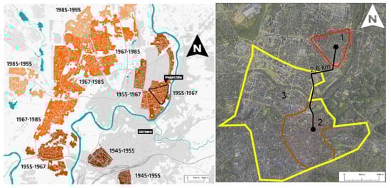 The Žirmūnai neighborhood was built in Vilnius around 1955 (Figure 1, left). It was planned according to the mass construction model, which had guaranteed residences for many residents. The neighborhood is 2–3 km from the city center (Figure 1, right), near the Neris River and near commercial and business centers. The Žirmūnai triangle is a part of the Žirmūnai microdistrict bounded by Tuskulėnai St., Minties St., and Žirmūnų st.