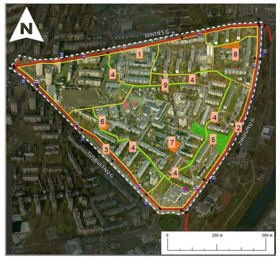 Vision for the Žirmūnai triangle. 1,2,3—pedestrian and bicycle paths along the main streets; 4—internal network of pedestrian paths; 5—public space, 6,7,8—sports and playgrounds, 9—public parking.