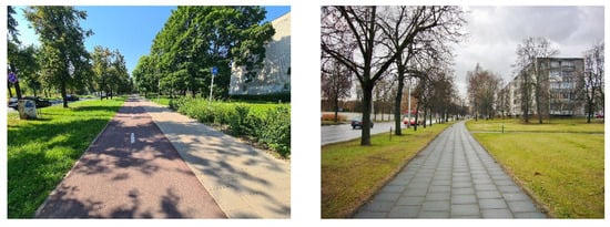 The Žirmūnai triangle is dominated by multistory apartment buildings, but also includes low-rise buildings and new multistory apartment buildings. The old multistory apartment buildings are outdated and do not meet energy consumption requirements. Residents are frustrated by the noise in their flats, the high heating costs, and the tightness of the buildings [79]. The neighborhood has a number of social services that are typical of a multistory apartment building neighborhood, such as kindergartens, a school, education centers, a library, and commercial, business, and retail services [80]. The public transport system in the neighborhood is well developed, as the district was built when the city was just beginning to expand [81]. Trolleybus routes run every few minutes, and the distances between stops are short, so journey times are satisfactory. Most of the mass housing estates have good public transport services. The neighborhood fully met the accessibility requirements for pedestrian routes [81], but there were some weaknesses that are also relevant for other multistory apartment building neighborhoods, such as worn pavements, a lack of proximity to the properties, trampled paths next to the paths, and sharp angled bends in paths. The unevenness of paths was noted, and no warning surfaces for the visually impaired were installed. Existing paths were interrupted at playgrounds or car parking areas. The existing path network did not meet the needs of the current population, was confusing and worn out, and was in need of renewal [81]. There were no bicycle paths in the neighborhood, as they were not planned at the time of the mass construction; the nearest is along the Neris river, which is intended for recreational use and not for daily trips. The Žirmūnai triangle has plenty of green spaces, but these have been poorly maintained with shabby and unrenewed plantations. There were also old children’s playgrounds on the neighborhood, with metal equipment that was unsafe and, therefore, not up to modern standards. There were no sports facilities in the neighborhood. The lack of parking is one of the most pressing and fundamental problems of multistory apartment building neighborhoods. It should be appreciated that neighborhoods were designed for a maximum of 170 cars per 1000 inhabitants, whereas the current level of motorization is around 500 cars per 1000 inhabitants. This problem can always be found in the literature and in examples of revitalization [82,83]. Residents park their cars wherever possible—on the shoulders of the highway, on pavements, on lawns, etc. [84].