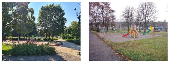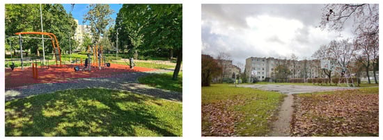 The revitalization project in the neighborhood included a 3.1 km bicycle and pedestrian path along the streets that bordered the neighborhood (Figure 3). The inner pedestrian paths of the quarter were upgraded, and footpaths were created in grassy areas. A public space of 1.2 ha was created (Figure 4), with quiet recreation areas, a playground for children under 3 years, a playground for children aged 4–12 (Figure 5) and a teenager’s active recreation area. There were three sports and active recreation areas (Figure 6) on the main streets of the neighborhood and a small quiet recreation area next to the neighborhood library.