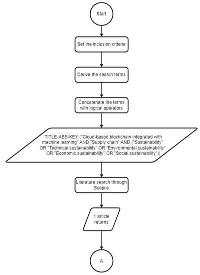 Based on the inclusion criteria, some search terms were derived. These included “cloud-based blockchain integrated with machine learning”, “supply chain”, “sustainability”, “technical sustainability”, “environmental sustainability”, “economic sustainability”, “social sustainability”, and “from 2017 to 2023”. These search terms were concatenated with some logical operators for the literature search which were processed by university libraries and some search tools such as ERIC, IEEE Xplore, Google, MDPI, ProQuest, ScienceDirect, Scopus, Springer, and Taylor and Francis.