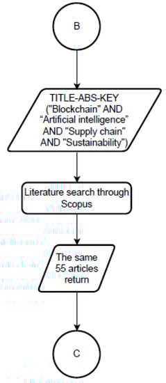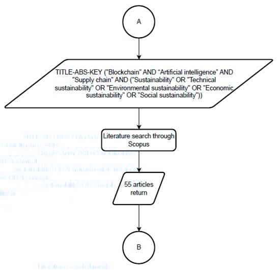 To search for more previous studies, less stringent search terms were used. For example, “Blockchain” and “Artificial intelligence” were used instead of “Cloud-based blockchain integrated with machine learning”. In the second search through Scopus, as indicated in Figure 2, the search string used was TITLE-ABS-KEY (“Blockchain” AND “Artificial intelligence” AND “Supply chain” AND (“Sustainability” OR “Technical sustainability” OR “Environmental sustainability” OR “Economic sustainability” OR “Social sustainability”)). Then, 55 articles were returned. All these articles were published from 2020 to 2023.