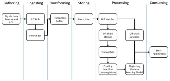 In Figure 5, at the gathering stage, signals from sensors and IoTs are gathered and then transmitted to the IoT hub cloud service. The IoT hub serves as a centralized aggregator at the ingesting stage. The IoT hub then streams the signals to the transaction builder via service bus, which provides stable messaging services in the Microsoft Azure cloud. At the transforming stage, the transaction builder transforms the signals into a standard format recognized as transaction records. These transaction records are then transferred to the blockchain cloud service, which stores the transactions into blocks in a blockchain network at the storing stage. After this, at the processing stage, the DLT watcher cloud service obtains the transactions and stores them in a database if the transactions do not contain malfunctions. The process of reading and writing data in the blockchain service induces a large number of overheads, including computing and storage consumption. Therefore, at the processing stage, off-chain storage and database are designed to offload the blockchain service and provide an easier approach for integrating with machine learning models. Some of the data in the off-chain storage and database can be prepared as testing data recursively, which can be used for creating or rebuilding a machine learning model. Once a new machine learning model is ready, it is deployed to integrate with smart applications at the consuming stage. Smart applications are application programs that offer recommendations based on analytical results from an AI method such as machine learning. For example, a risk management smart application recommends a cargo ship not to travel along a danger zone and provides a data-driven estimate of time in transit based on an analysis of historical geolocation records.