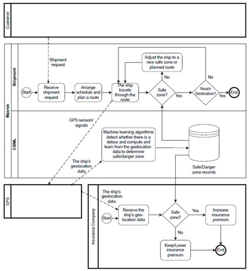 Maersk’s container ships are installed with global positioning system (GPS) sensors which can be used to continuously detect the ships’ geolocations and transmit these geolocation data through the GPS to the blockchain network. In BPMN in Figure 6, the dashed arrows indicate message flows. The dashed arrow from the GPS to the machine learning algorithms in CBML indicates the message about the ship’s geolocation data flows from the GPS to the machine learning algorithms. The machine learning algorithms in the blockchain will continue computing and learning from the updated geolocation data (e.g., weather conditions at the locations) together with the historical data stored in the database on the blockchain network, and indicate if the container ship is still in a safe zone or not. Additionally, once a container ship accidentally detours from the planned route, its GPS sensors detect the detour and send the detour to the blockchain network. The machine learning algorithms on the blockchain perform data analytics processes and indicate if the detour is safe or not. These machine learning algorithms enable risk control by guiding the container ship to adjust to a new or planned safe route. Furthermore, these machine learning algorithms help to adjust marine hull insurance premiums—when the ship is in a danger zone, the insurance premium will be increased for higher shipment risk; when the ship is back in the safe zone, the insurance premium will be lowered; when the ship continues to travel along a safe zone, the insurance premium is maintained.