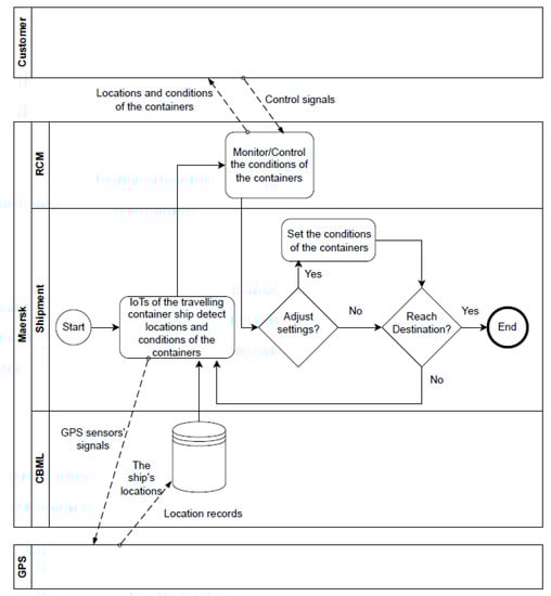 In addition, on top of CBML, Maersk has implemented a remote container management (RCM) system for monitoring the locations and conditions (e.g., temperature, humidity, and power settings) of containers, allowing its customers to adjust some settings (e.g., oxygen and carbon dioxide levels) of the containers to keep the products, especially food, inside the containers in good condition. For this implementation, the containers are installed with IoTs which can detect the conditions of the containers and send the data about the conditions to the RCM system. Maersk’s customers can control the conditions of the containers by adjusting the settings of the containers through the RCM control, as demonstrated in the BPMN in Figure 7.