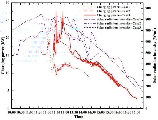 - Theoretically, there is a quantitative relationship between solar radiation intensity and charging power, but it is difficult to express in a relational expression. Their trend of change is similar; the peak of charging power often appears when the solar radiation intensity is close to the maximum. In addition to case 1, from case 2 and case 3, we can see that after the solar radiation intensity is less than 548 W/m2, the decreased rate of charging power is close to the decreased rate of solar radiation intensity.