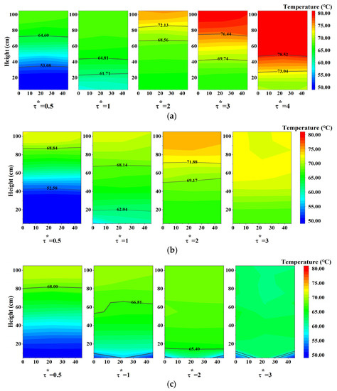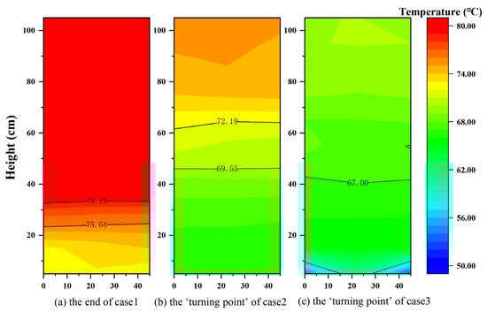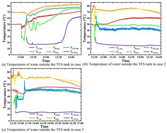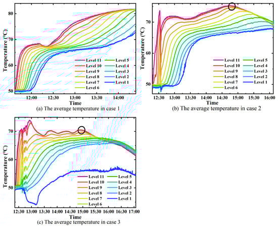 - As an inertial link, the heat storage tank itself can effectively stabilize the fluctuation in solar energy and stabilize the outlet water temperature while participating in heat storage. The average temperatures of the discharging outlet corresponding to case 1, case 2, and case 3 are 76 °C, 73 °C, and 69 °C, respectively. These temperatures are all higher than the phase change temperature of the paraffin. In addition, the time that case 1, case 2, and case 3 can supply the hot water above 69 °C is 1 h 56 min, 3 h 32 min, and 2 h 44 min, respectively. A value is found when the solar radiation intensity is lower than this value (535 W/m2); the temperature at the top of the heat storage tank begins to decrease continuously. Subsequent experiments can fine-tune the discharging flow rate according to this value to further stabilize the discharging outlet temperature.