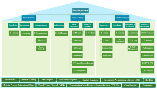 The infrastructure and technology are connected through co-operative businesses, applications, and stakeholders. Transmission control protocol/internet protocol (TCP/IP) and wireless networks, the Internet of Things (IoT), cloud computing, and blockchain are technologies that support applications. Big data analytics (BDA) and application programming interface (API) are important technologies that can improve efficiency, security, and governance. Data analytics and artificial intelligence (AI) are effective tools for assisting co-operatives in making data-driven decisions. Robotic process automation (RPA) is a technology that aims to minimize costs and increase efficiency in routine tasks. The digital signature is a cryptographic operation that combines an electronic signature with the data used to verify the signature process to ensure security and compliance. The virtual private network (VPN) is an important technology that uses a virtual connection to transport data packets from a private network to remote locations. These are important for facilitating and controlling all smart co-operative management system functions. Finally, the technology investment must show the business value to deliver the IT government.