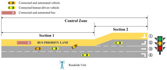 The scenario in this research is a signalized intersection under a partially connected and automated traffic environment. As shown in Figure 1, a control zone consists of two sections: Section 1 and Section 2. Section 1 contains three lanes, the topmost lane is for bus priority, namely the bus-priority lane (BPL). The other two lanes are for general purposes, namely the general-purpose lane (GPL). Due to the lane channelization for different turning movements, Section 2 contains four lanes. lane ① is BPL and lanes ②③④ are GPLs. Each GPL is dedicated to a special turning movement. All general vehicles run on the GPLs when they come into the road section. The general vehicles are composed of connected and automated vehicles (CAV) and connected and human-driven vehicles (CHV). All vehicles enable communication with other vehicles and the roadside unit via vehicle-to-vehicle (V2V) and vehicle-to-infrastructure (V2I) in real-time. CAVs can be controlled at a microscopic level. As for CHVs, they are driven by humans and move at their own will. The BPL is designed to ensure absolute bus priority and is open to CAVs if they have no interference with buses.