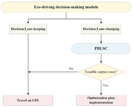In this section, the logic of the proposed eco-driving strategy is introduced (Figure 2). The eco-driving strategy is designed for all CAVs in the control zone. The strategy has two crucial components: the eco-driving decision-making module and the phase-switch-based bus lane sharing controller (PBLSC). The eco-driving decision-making module collects global traffic information from vehicles and roadside units. Based on the global traffic information, this module determines whether CAVs should take lane-changing maneuvers or not. If the decision is lane-changing, the PBLSC is activated to optimize trajectories for CAVs from longitudinal and lateral dimensions. If the output trajectories are feasible, CAVs can be controlled to share the BPL and implement optimization plans. Otherwise, CAVs continue to run on the GPL. Some detailed information about these two components has been described in the following sections.