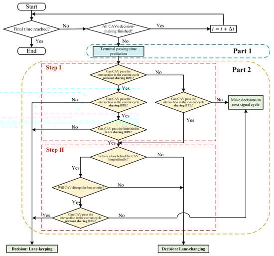 Part 2. Lateral decision-making: This part adopts a rule-based approach to determine whether CAVs should share the BPL or not. It can be divided into two steps: Step I and Step II. Step I is designed for CAVs to determine whether to share the BPL and which signal cycle to pass. Step II is designed for CAVs to judge if transit buses would be disrupted when CAVs share the BPL.