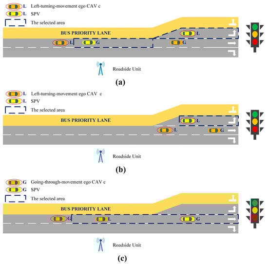 (a) Definition of SPV for the ego CAV with left-turning movement intention on the upstream section. (b) Definition of SPV for the ego CAV with left-turning movement intention on the downstream section. (c) Definition of SPV for the ego CAV with going-through movement intention.