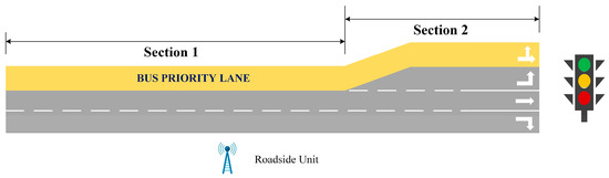 The testbed of the simulation experiment is presented in Figure 5. In the testbed, the road network with a signalized intersection is composed of two sections. The length of Section 1 is 350 m and the length of Section 2 is 150 m. One lane is the bus-priority lane (BPL) and the others are general-purpose lanes (GPL). Beside it, the roadside unit enabling V2I communication with vehicles is built. All vehicles enable communication via V2V. The simulation platform is based on PTV-VISSIM because PTV-VISSIM has a high simulation speed and a user-friendly GUI.
