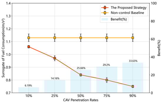 Figure 6 shows the results of the fuel consumption comparison under various CAV penetration rates (CPR) (demand level = 1.6). Compared to the non-control baseline, the proposed strategy has the benefit of fuel efficiency improvement. Such a benefit grows with CPR. To be noted, the proposed strategy can save up to 33.63% of fuel consumption when the CPR is 90%. The reason is that the proposed strategy can control CAVs to avoid frequent stop-and-go when approaching the signalized intersection.
