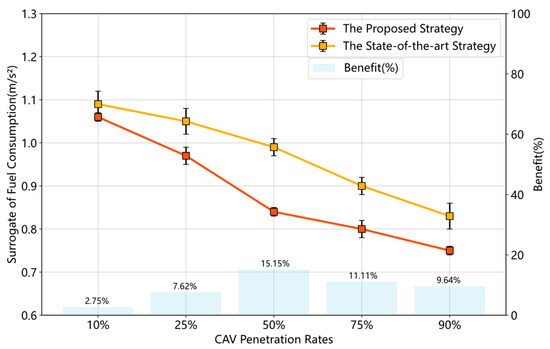 Figure 7 shows the fuel consumption comparison result between the state-of-the-art strategy and the proposed strategy under various CPR. Compared with the state-of-the-art strategy, more benefits of fuel efficiency can be achieved with the proposed strategy. When the CPR is 50%, the proposed strategy could save fuel by up to 15.15%. The reason is that the proposed strategy makes more CAVs approach the intersection smoothly by allowing them to achieve phase-switch-based bus lane sharing. Such phase-switch-based bus lane sharing makes CAVs pass the intersection without frequent acceleration and deceleration.