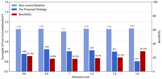 The fuel consumption comparison between the non-control baseline and the proposed strategy under various demand levels.