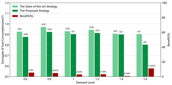 The fuel consumption comparison between the state-of-the-art strategy and the proposed strategy under various demand levels.