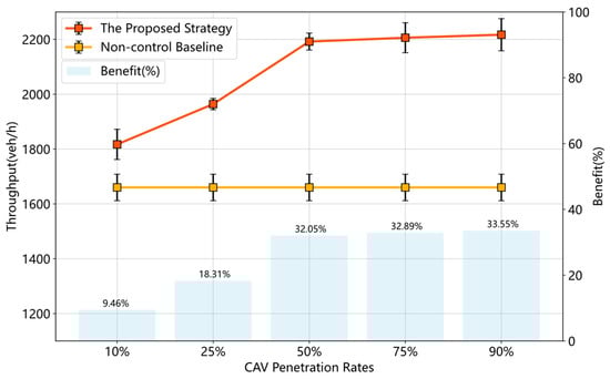 Figure 10 shows the result of the throughput comparison between the non-control baseline and the proposed strategy under various CPR (demand level = 1.6). The benefits of throughput improvement increases from 9.46% to 32.05% when the CPR ranges from 10% to 25%. When the CPR is 50% or over, significant benefits of throughput improvement can be observed. However, no obvious benefits of throughput improvement can be achieved when the CPR is more than 50%. It makes sense that there is no more available space for CAVs to share the BPL when the CPR is high.