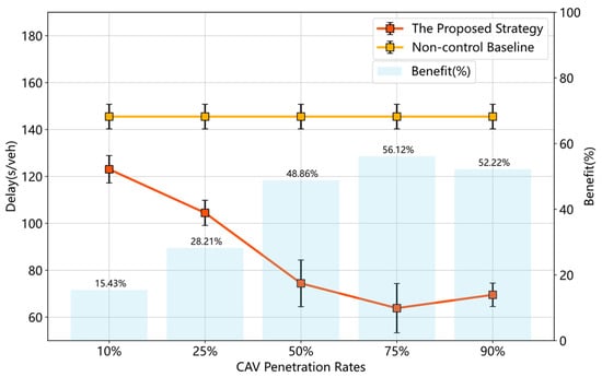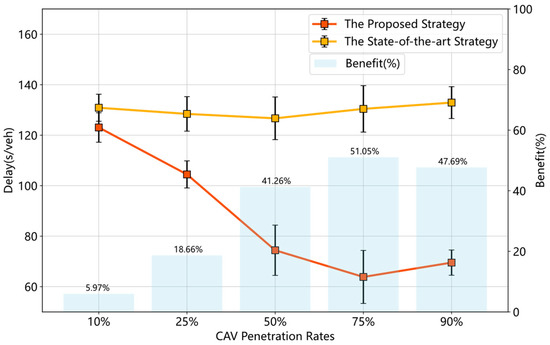 Figure 11 shows the result of the average vehicle delay comparison between the state-of-the-art strategy and the proposed strategy under various CPR. The results reveal that the proposed strategy achieves the benefits of delay reduction. Notably, when the CPR is 50% or over, such benefits are more obvious. That is because the proposed strategy can control more CAVs to pass the intersection without stops during a target green phase when the CPR is high.