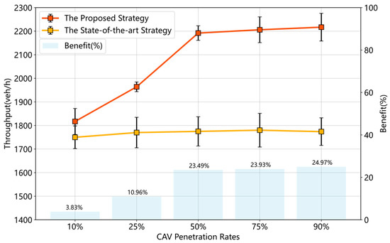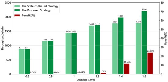 Figure 16 is the result of the throughput comparison between the state-of-the-art strategy and the proposed strategy in different demand levels (CPR = 75%). Under the non-saturated (demand level = 0.6, and 0.8) and saturated conditions (demand level = 1.0), the proposed strategy has no throughput benefits. The reason is that the uncongested roads could easily handle all vehicles and thus have no room for improvement. The proposed strategy outperforms the state-of-the-art strategy under oversaturated conditions (demand level = 1.2, 1.4, and 1.6). Some reasons can be selected to explain that. Due to the PBLSC, the proposed strategy can make more CAVs share BPL than the state-of-the-art strategy.