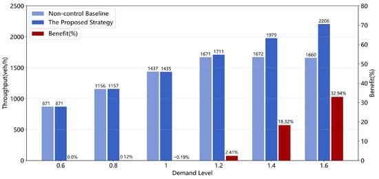 The result of throughput comparison between the non-control baseline and the proposed strategy under various demand levels.