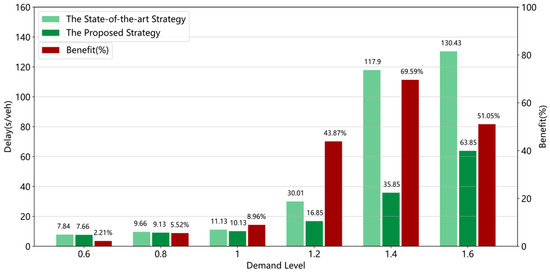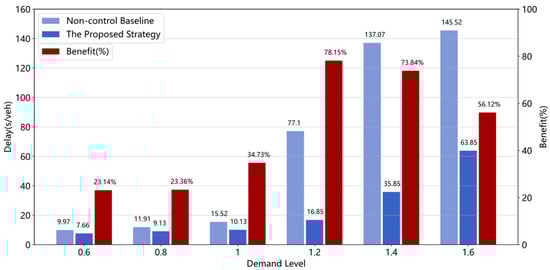 The result of delay comparison between the non-control baseline and the proposed strategy under various demand levels.