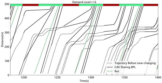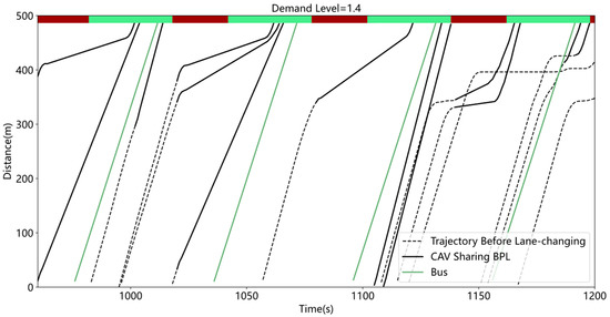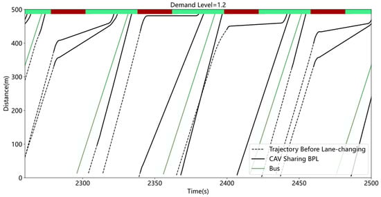 As shown in Figure 18, Figure 19 and Figure 20, these results are vehicle trajectories optimized by the proposed strategy on the BPL under oversaturated demand levels (1.2, 1.4, and 1.6). The solid black lines denote trajectories of CAVs sharing the BPL and the dashed black lines denote trajectories of CAVs before sharing the BPL. The green lines represent the bus trajectories. As shown in these results, due to the proposed strategy, more CAVs can be controlled to bypass the traffic queue and pass the intersection without stops during a target green phase to improve efficiency. Furthermore, frequent acceleration and deceleration caused by severe congestion can be reduced after lane-changing to improve traffic sustainability.