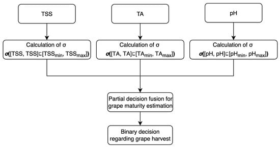 Figure 2 explains in a flow chart the basic decision-making by the FLRule. In particular, partial decision-making is carried out by calculating the degree of satisfaction of a constraint by an inclusion measure function per grape maturity index. Then, the partial decisions are fused toward estimating the grape maturity. In conclusion, a binary decision, i.e., “harvest” or “not harvest”, is taken conditioned on a user-defined threshold toward a discriminative grape harvest. Note that the basic decision-making explained in
