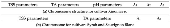 The algorithm included certain constraints in order to guarantee that the parameter values (individuals) yielded in each generation result in a ν(x) function that is strictly monotonically increasing. In addition, further constraints were applied to each individual so that the λ parameters were always in the range [0, 1]. For each optimization experiment, 1000 individuals were initially generated to serve as the initial population. The genetic algorithm was executed for 1000 generations. At the end of the optimization process, the parameters of the best individual were extracted and applied to the corresponding equations in order to determine the maturity percentage of the grapes, given three measurements for the TSS, TA and pH indices.
