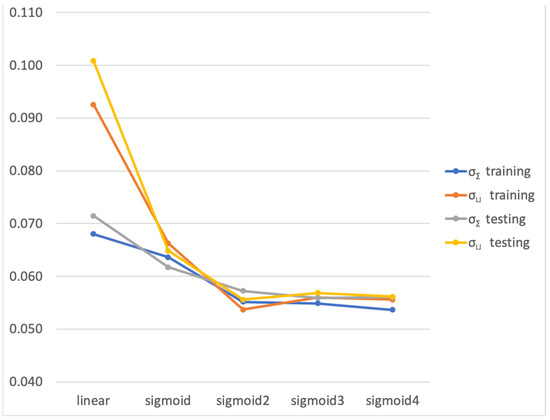 v(.) were considered, namely linear and sigmoid. The clearly superior performance of the sigmoid function was attributed to the fact that a sigmoid function has more tunable parameters, namely three, compared to a linear function which has only two tunable parameters. Next, experiments were carried out by considering convex sums of sigmoid functions in order to further increase performance by increasing the number of tunable parameters. The best results were obtained for the sum of two sigmoid functions; whereas, for more than two, the performance slightly deteriorated as demonstrated in