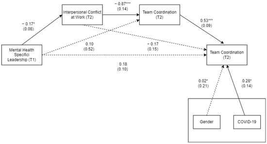 Figure 1 shows the direct effect coefficient. (MHS) Leadership has a negative and significant direct effect on interpersonal conflict at work (T2), but there is not any significant impact on team coordination (T2) and teamwork (T2). Interpersonal conflict at work (T2) does not significantly influence teamwork (T2). However, team coordination shows a significant effect on teamwork (T2). Concerning covariates, gender shows no influence on the dependent variable, whereas the impact of COVID-19 has a significant effect.