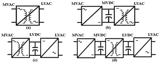 SST architectures: (a) single-stage SST; (b) two-stage SST with MVDC link; (c) two-stage SST with LVDC link; and (d) three-stage SST.