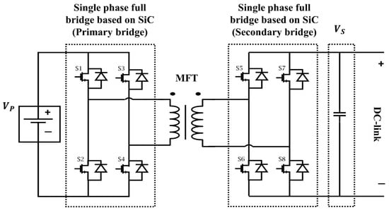Power electronic converters are essential components in the SST. The conventional silicon semiconductor switches consume more power losses compared to the advanced wide bandgap (WBG) semiconductors, i.e., silicon carbide (SiC) and gallium nitrate (GAN) [25]. In this work, the SiC MOSFET is used, as the on/off transition periods are extremely smaller compared to that of silicon-based IGBTs. Therefore, lower switching losses are attained by using SiC MOSFETs [26].