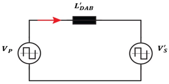 To simplify the steady-state operation analysis, the small series resistances of the equivalent model of the transformer and large magnetizing inductance are neglected. The simplified equivalent circuit of the DAB is shown in Figure 4. The transformer is substituted by the primary-referred equivalent leakage inductance, which is calculated as