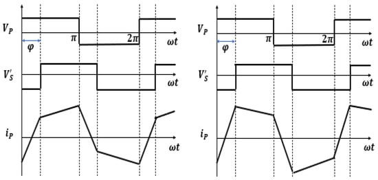The DAB is operating in buck mode when and in boost mode if . Figure 6 displays the transformer current waveform of the DAP in buck and boost modes.