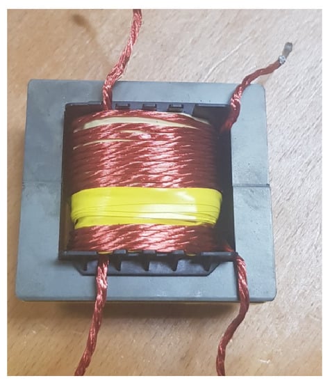 The transformer prototype was built using precast components. These components are an EE core, a former, litz wire, polyester tape, and mounting components. The final constructed transformer prototype is illustrated in Figure 8. The DC resistances and inductances of transformer windings are measured by an LCR meter from PK Precision (Model 889A) and the results are shown in Table 5.