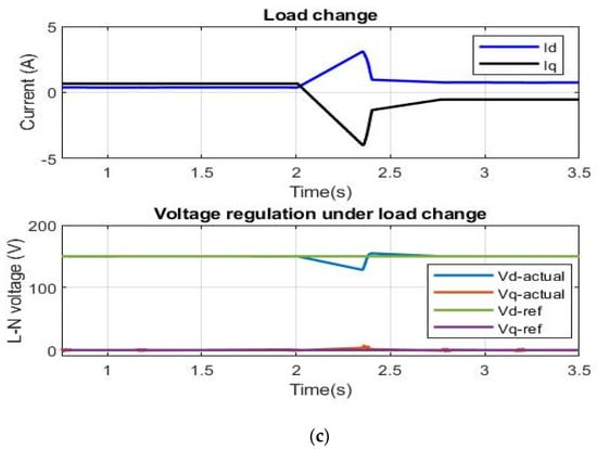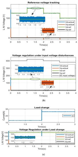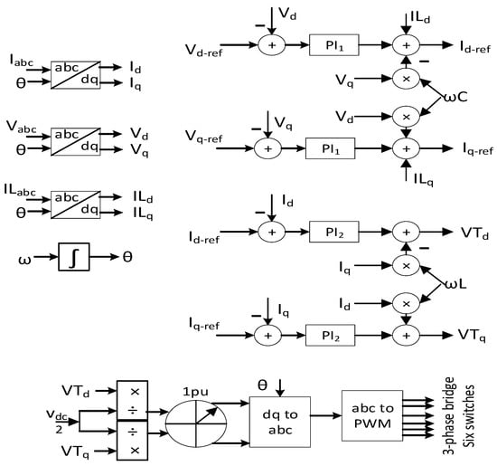 The three-phase inverter is modeled with a closed-loop control strategy based on the synchronous reference frame (SRF). The capacitor voltage dynamics in the dq frame is given by the following equation [35,36]:
