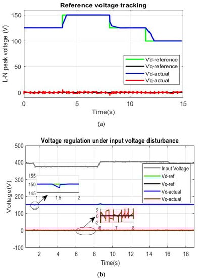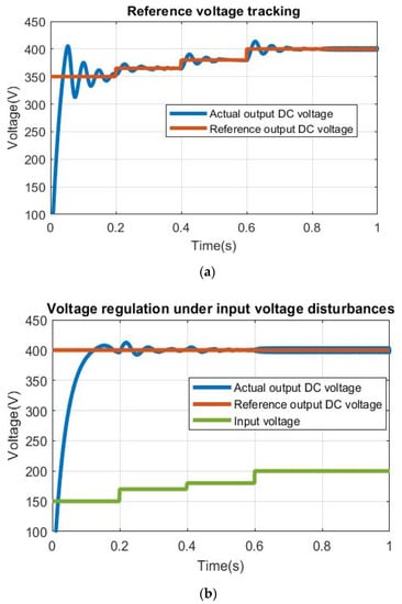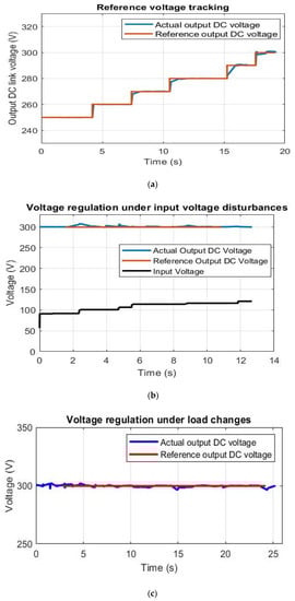 Experimental results of DC-DC stage control for the three cases: (a) voltage reference tracking; (b) voltage regulation under input voltage disturbances; (c) voltage regulation under load changes.