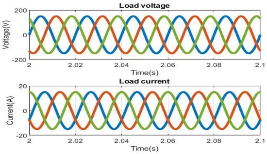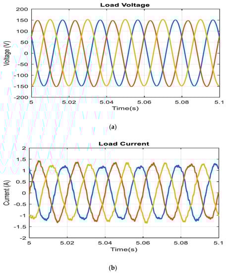 It is clear from the above figures that the three-phase inverter exhibits a better dynamic response with fast tracking capability in all three cases. Therefore, the controller scheme proves its superior performance experimentally and the slower response compared with the simulation is due to the delay, the error introduced by the measurement tools, and how the measured signals were recorded. It can be noted from Figure 20 that the controller produces a well-regulated, stable sinusoidal voltage and current waveforms in a steady-state response. In the experimental part, the three-phase inverter was loaded by a three-phase induction motor, which initiates small harmonics in the load current.