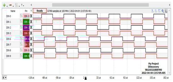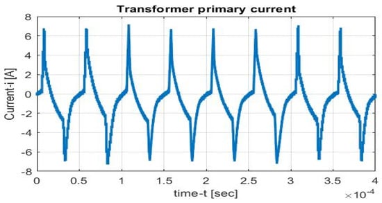 As shown in the figures of the three cases, the developed controllers for the dual active bridge topology are autonomous and effective in tracking the desired output reference voltage experimentally. In addition, the test results presented above show that the DC outputs have a low ripple voltage. The AC transformer primary current is measured and plotted in Figure 18, which is consistent with the theoretical waveform of the dual active bridge in Figure 6.